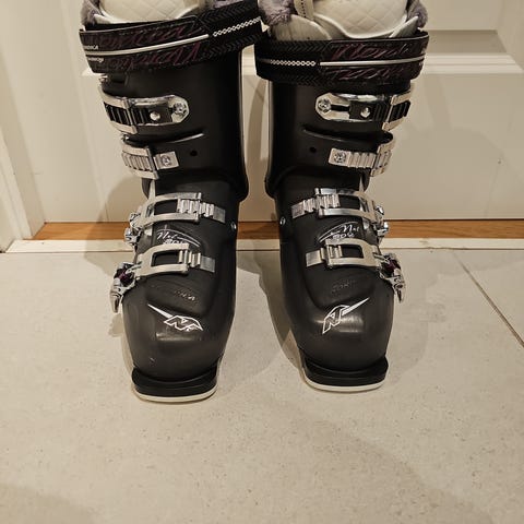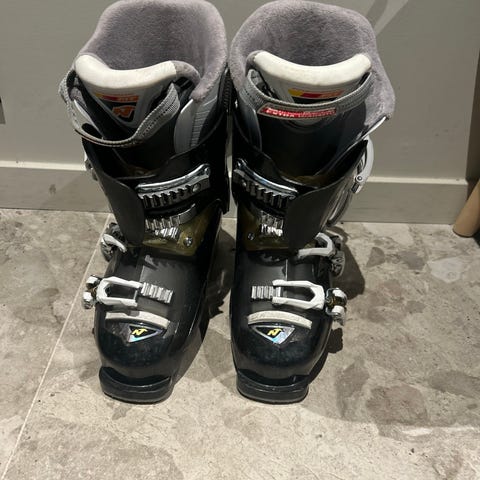 Nordica alpinstøvler i svart og grå farge, str 24,5 som tilsvarer 37/38. Støvlene har fire spenner i metall med mikrojustering for presis tilpasning, samt myk og polstret inni med grått fôr for økt komfort. Modellen har bærestropp bak for enklere transport og håndtering. Egnet til alpint bruk i preparerte bakker.