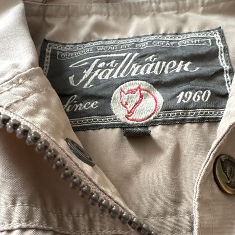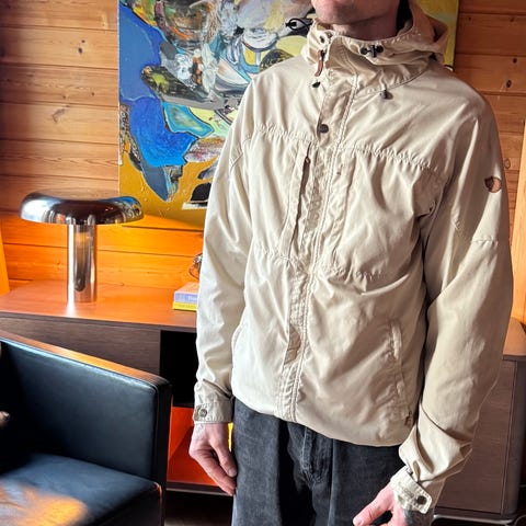 Svakt slitt i stoffet, men hel og greit fint (unntatt hullet i lomma)