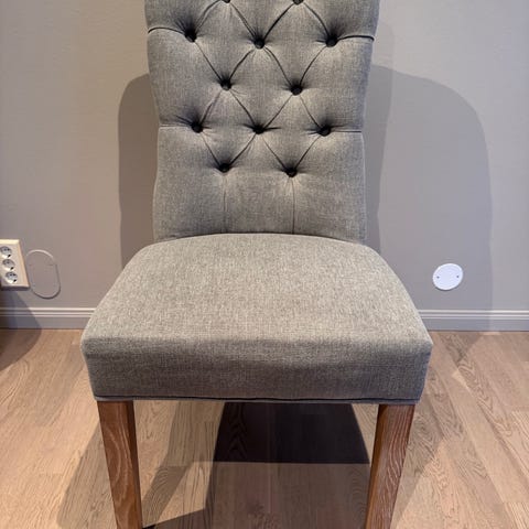 Stolene har et eksklusivt tekstiltrekk i en nøytral grå/beige tone, dekorative nagler på baksiden og mørke treben som gir et klassisk preg. Svært god sittekomfort med solid polstring i både sete og rygg.