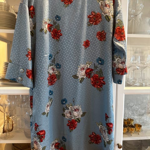 Kjolen er i viskose og foret så den henger pent på kroppen. Modellen er lang med kort erm og markert midje. Glidelås bak på ryggen.