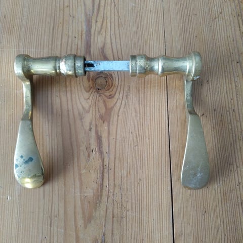 Dørvrider i messing med rektangulære håndtak og runde rosetter. Leveres som komplett sett med gjennomgående firkantpinne og skruer, egnet for innvendig dør. Klassisk utforming som passer til tradisjonelle dører i tre eller lignende materiale.
