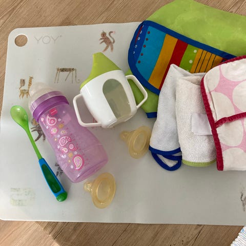 Sett med barneutstyr bestående av flere kopper med tut og håndtak samt en tallerken. Delene er i ulike farger som rosa, lilla, gul og oransje. Tallerkenen har dyremotiv og er formet med kant som gjør det enklere for barnet å få tak i maten. Koppene har tut og noen har doble håndtak som gir godt grep for små hender. Materialet ser ut til å være plast og/eller silikon, egnet til bruk for små barn ved måltider og drikke.