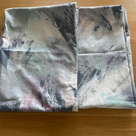Hjemmesydde gardiner i stoff av god kvalitet, 2 lange lengder med enkel rynkekant. De er fra år 2000, men forholdsvis lite brukt og derfor i god stand.