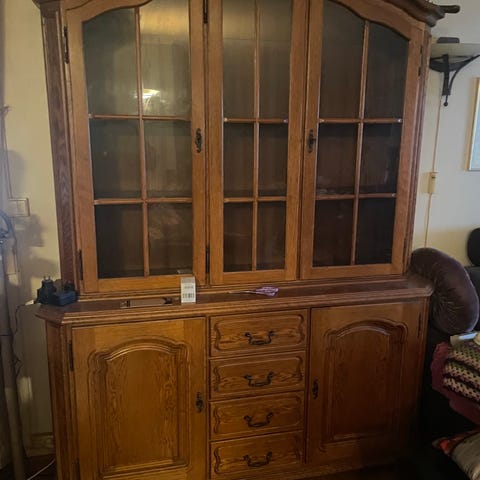 Fint hjørneskap i eik med blyglass. Må hentes.