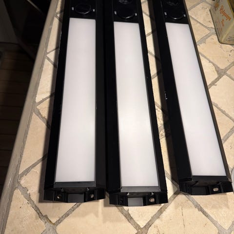 Flat hvit armatur til montering under overskap el. Egnet som innendørs belysning, for eksempel under overskap, langs vegg eller i tak der man ønsker en langstrakt lyskilde. Leveres som avbildet, med tre like lister innpakket i bobleplast.