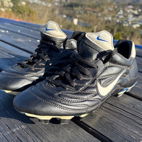 Pakke med fotballutstyr som inkluderer fleire par fotballsko i ulike størrelsar. Leggskinn og fotballstrømper. Utstyret passer til bruk på fotballtrening og kamp.