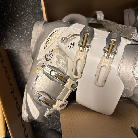 Nordica skistøvler i hvit, grå og turkis farge. Modellen har fire justerbare spenner og powerstrap øverst for bedre tilpasning rundt leggen.