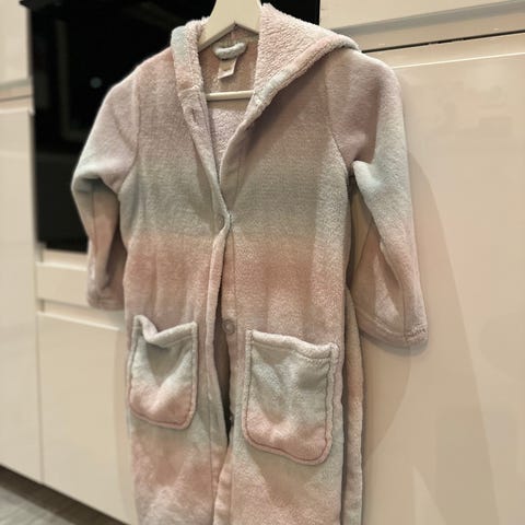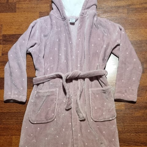 KappAhl morgenkåpe for jente i one size. Morgenkåpen er lilla og laget i myk fleece. Modellen har hette, knapper foran, knytebelte i livet og påsydde lommer foran. Passer godt som behagelig plagg hjemme eller etter bad.