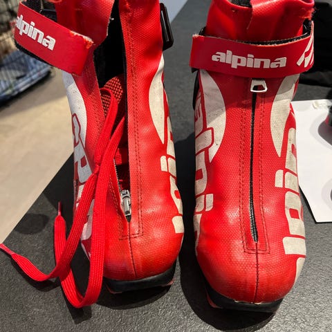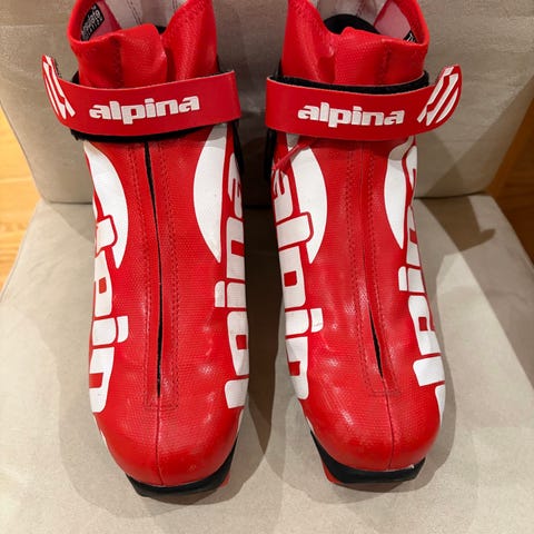 Alpina langrennsstøvler. Overdel med glidelås foran og borrelåsreim over vristen. Støvlene har høy ankelstøtte og er egnet til klassisk langrenn.