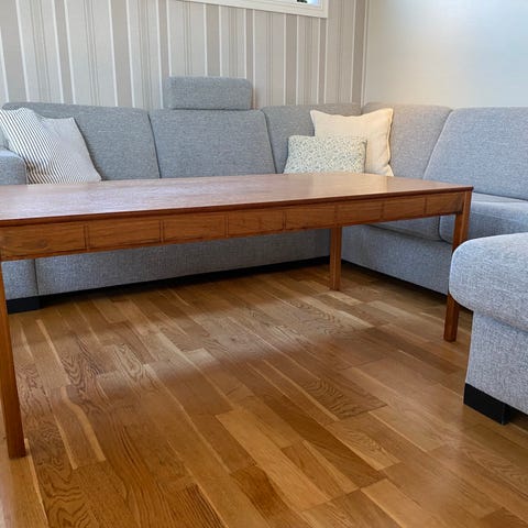 Teak salongbord selges, kjøpt brukt for 2 år siden. Har en liten skade i overflaten, etter at jeg vasket for hardt med en klut. Dersom bordet slipes ned med litt sangpapir og oljes på nytt kan du få det helt fint igjen Selges som det er.