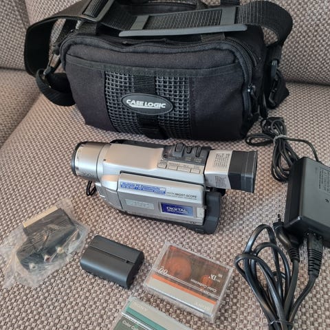 Videokameraet har ligget lagret i noen år og er som nytt, det følger med veske og alle nødvendig kabler+ en tape som står i.