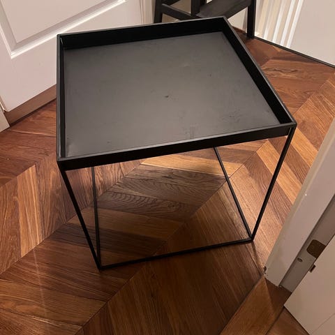Selger et pent og praktisk lite bord i sort lakkert stål. Bordet har et stramt, moderne uttrykk som passer perfekt inn i de fleste rom, enten som sofabord, sidebord i gangen eller som et nattbord på soverommet.