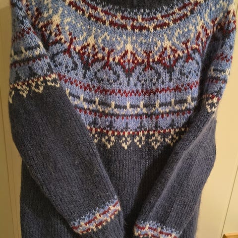 Jeg har nå en FØYKA lyngfarger i str M med lav hals ferdig strikket i kombinasjonen med Blåne pellsullgarn og Alafosslopi.