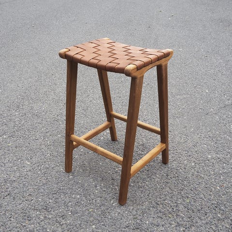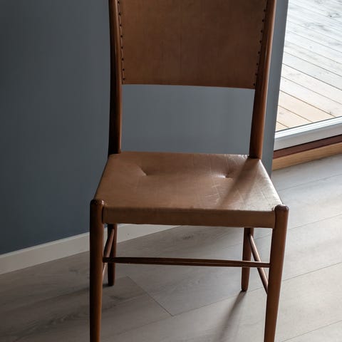 Spisestuestoler i heltre resirkulert teak og skinn.