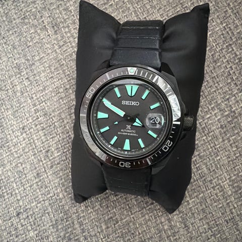 Seiko Prospex herreklokke. Modellen har rund urskive med tydelige indeksmarkeringer og datovisning, samt dreibar bezel. Klokken leveres på lenke og kommer i original Seiko Prospex-eske med ekstra ledd og dokumentasjon synlig på bildene. Passer som robust hverdagsklokke til herre.