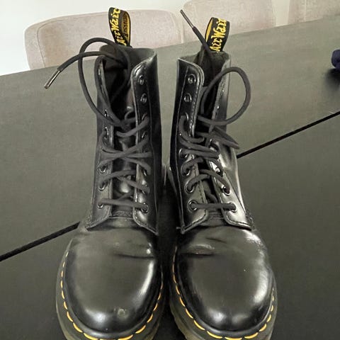 Støvlene er laget i svart skinn med snøring foran og kraftig, mønstret yttersåle i gummi. Klassisk gul søm langs sålen og hempe bak på skaftet for enkel av- og påtaking.