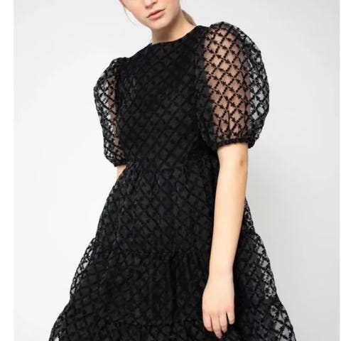 Floyd festkjole for dame i størrelse L. Kjolen er svart og laget i polyester. Den har korte ermer og dekorative blondedetaljer med hullmønster øverst og på ermene. Livet er markert med bredt bånd, og skjørtet har flere partier med struktur og mønster. Passer som penkjole til formelle anledninger og fest.