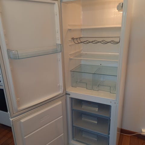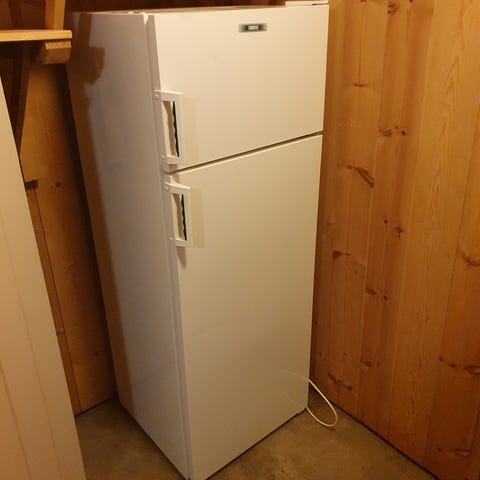 Kombiskapet har kjøledel øverst med flere glasshyller og grønnsaksskuffer, samt dørhyller for oppbevaring av flasker og mindre varer. Nederst er det frysedel med tre transparente skuffer.