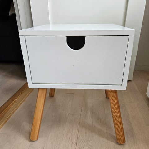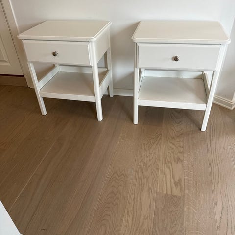 Nattbordene er i god stand, med noen mindre bruksmerker. Disse påvirker ikke funksjonen og er lite synlige i interiøret.