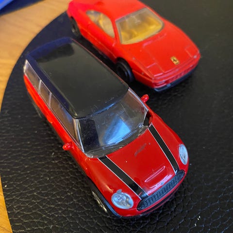 Leketøysbiler i boblemodell i to farger, rød og blå. Bilene har detaljer som åpnebare dører og panser, samt innredning i lys plast. Karosseriet er i hard plast eller metall med påmalte striper på sidene. Passer som lekebiler eller som enkle samleobjekter. Størrelse er ikke oppgitt, men bilene er små og egnet for bord- eller gulvlek. Samleobjekt og kan sendes ! Men ikke fiks ferdig! Selges Samlet!