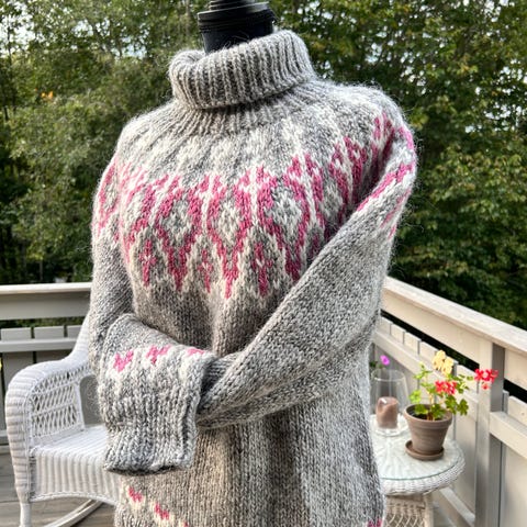 Et vesentlig dyrere garn enn Alafosslopi, derfor høyere pris på disse genserne.