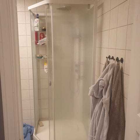 Dusjkabinett fra 2021, frost glass på baksiden. Demontert nå.