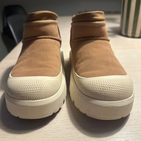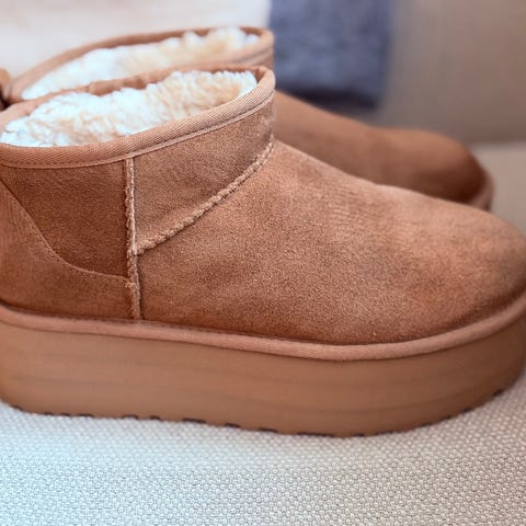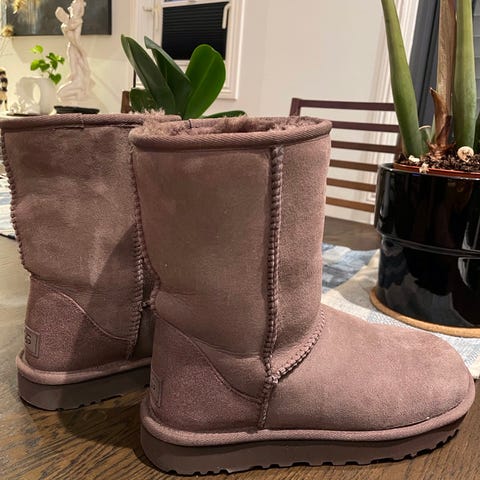 UGG støvler i størrelse 38. Ankelhøye støvler i brun farge med liten hæl. Modellen har dekorrem rundt ankelen og elastisk felt i siden for bedre passform. Passer til hverdagsbruk i kjøligere vær. Teddyfor i sålen.