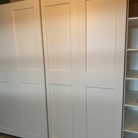 Vi har kjøpt inn ekstra hyller, så skapet har god plass til lagring av klær og annet.