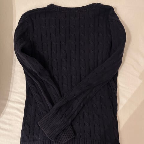 Polo Ralph Lauren genser for gutt i størrelse 164. Genseren er strikket i bomull og har mørk blå farge. På brystet er det et stort, strikket motiv av det amerikanske flagget, og nede foran er initialene "RL" brodert. Genseren har rund hals og ribbestrikkede kanter på ermer og nederkant. Passer til hverdagsbruk eller som en varm genser over annen bekledning.