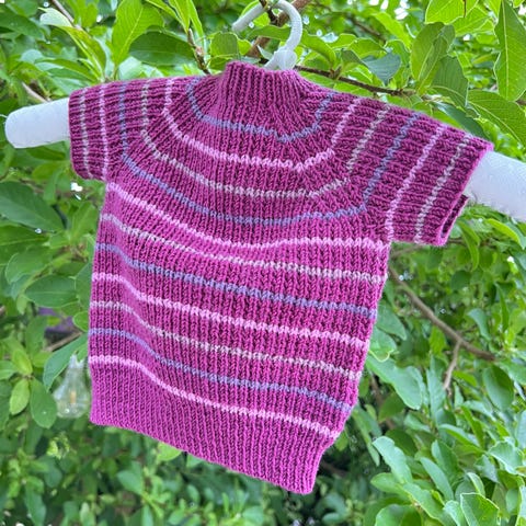 God og vel utprøvd fasong. Dette er ein restegarn- genser med fleire nyanser i stripene