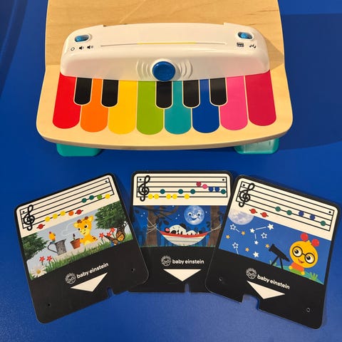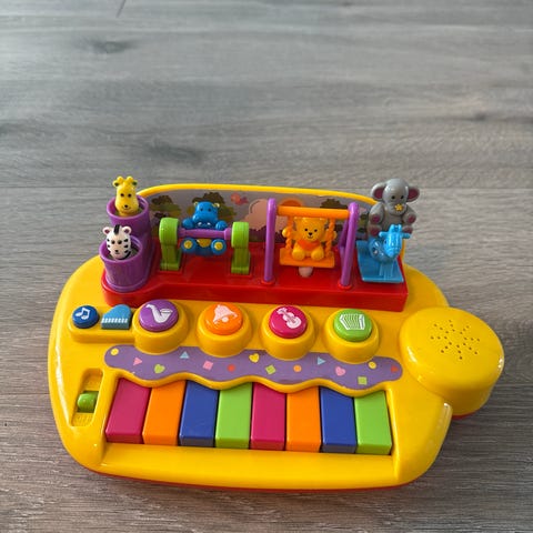 Fisher-Price lekepiano med fargerike tangenter og bærehåndtak. Pianoet har flere store plasttangenter i ulike farger og figurer av and, fiolin, trompet og harpe på toppen. Egnet som musikalsk leke for små barn til å utforske lyd og farger. Laget i plast og tilpasset barnehender. Kan brukes på gulv eller tas med ved hjelp av håndtaket.