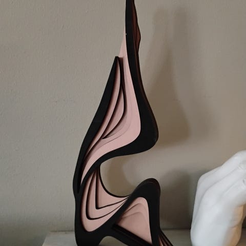 Dekorativ skulptur med stablede steinformer i ulike farger montert på en kubisk sokkel med marmormønster. Skulpturen har organiske, avrundede former i nøytrale og varme toner, og står på en mørk marmor fot. Egner seg som interiørdekor på skrivebord, hylle eller sidebord i stue, kontor eller andre oppholdsrom.