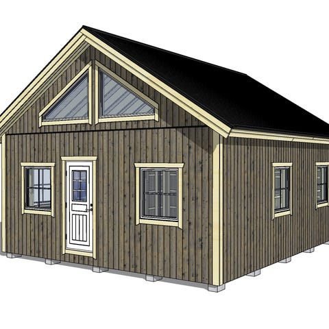 Trehus byggesett i bindingsverk levert av PreTre AS i Stryn med saltak 55 m2. Illustrasjonene viser bærende trekonstruksjon med takstoler, veggstendere og åpninger for dører og vinduer. Egnet som grunnlag for oppføring av mindre hus, hytte eller anneks der ytterkledning, isolasjon og innredning tilpasses etter behov.
