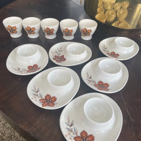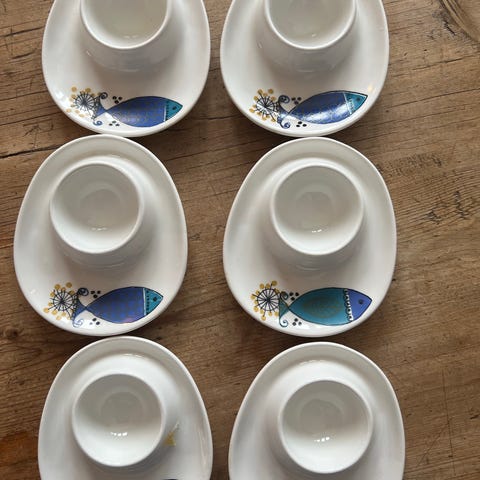 Ett av eggeglassene har en liten avskalling på kanten, se bilde. Det koster kr 45.-.