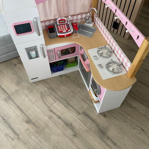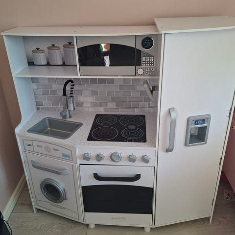 Det selges med masse tilbehør til kjøkkenet, matvarer, gryter. o.l.