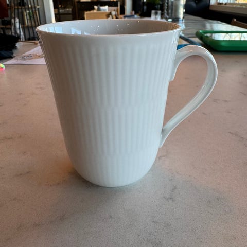 Royal Copenhagen termokrus i porselen. Settet består av fire krus i blå og hvit farge med rillet struktur. Krusene passer til varme og kalde drikker og kan brukes til daglig bruk på kjøkken eller spisebord. Klassisk design som kan kombineres med annet servise fra samme merke. Selges samlet kr 300;-. Kjøp av enkelt kr 100;- 35 CL