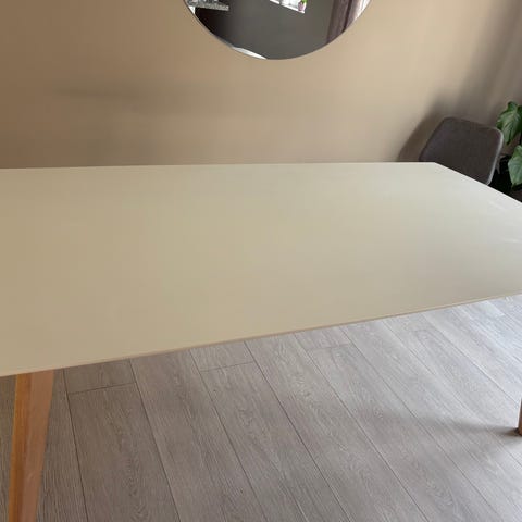 Pent brukt spisebord med 2 ileggsplater. (Stoler medfølger ikke)