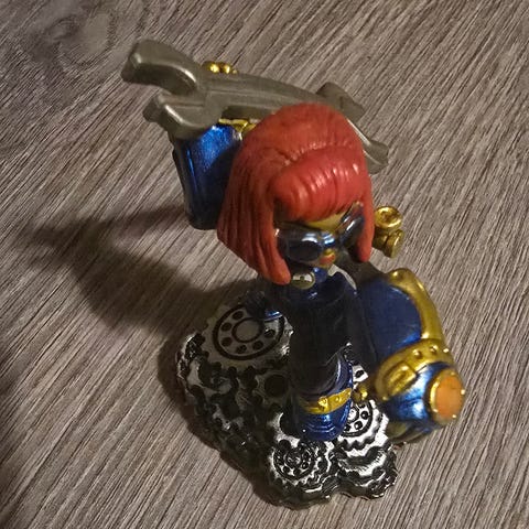 Skylanders figur med blå rustning og stor kanon. Figuren står på en lys grå base formet som en sky. Den har gule klør og detaljer, hvite fjær og en mørk slangeformet kabel som går til kanonen. Egnet som samlerfigur eller til bruk i Skylanders-spill som støtter denne typen figur, forutsatt at spill og portal er kompatible.