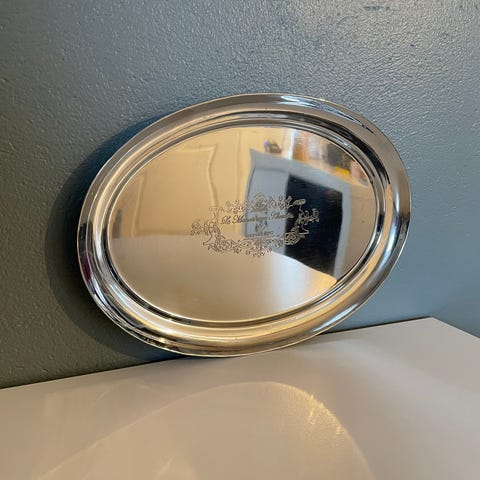 Lite sølvfarget serveringsfat. Oval form. Pent, men godt brukt.