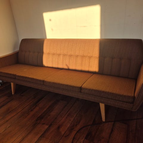 Vintage treseters sofa i god stand. Røde puter (noe rødere enn de fremstår på bildene) og mørkt tre. Alle trekkene kan tas av og vaskes/skiftes.