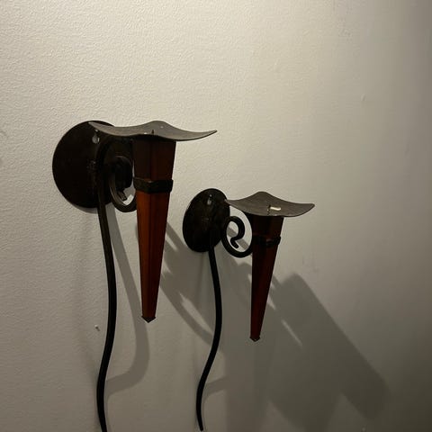 To veldig pent brukte vegghengte lysestaker med glassbolle til telys.