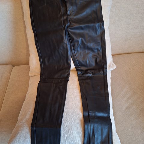 Veldig fin, tettsittende skinnbukse (vegansk) i str S 🫶🏼 Flatterende passform, veldig fin til støvletter. Pent brukt, kanskje brukt 2-3 ganger. Den har semsket skinntekstur/velur på innsiden, så den er myk og god mot huden og føles ikke klam. Som man ser på nærbilde, så er det en god skinnimitasjon - skinnet ser veldig ekte ut, og er mykt som smør 🫶🏼