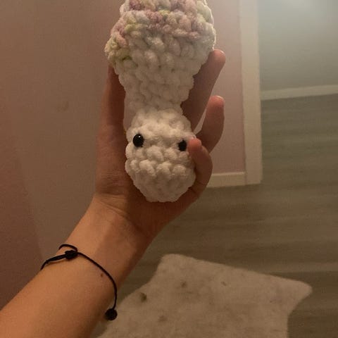 Heklet kosedyr formet som en slange i pastellfarger, laget med mykt garn. Cirka 65 cm lang.