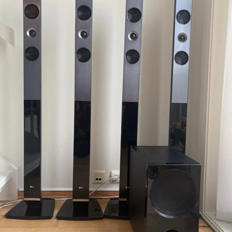 LG HB965TZ Blu-ray hjemmekinoanlegg 5.1 i svart. Systemet består av fire høye fronthøyttalere, én senterhøyttaler og én subwoofer. Hovedenheten har innebygd Blu-ray-spiller og støtter 5.1-kanals surroundlyd.