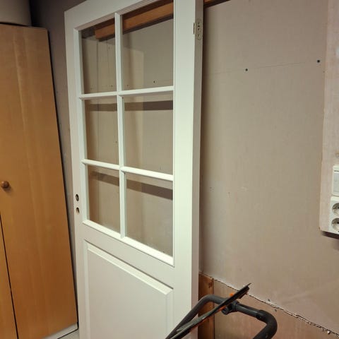 Brukt dør i furu, med glass. Døra er malt kvit.