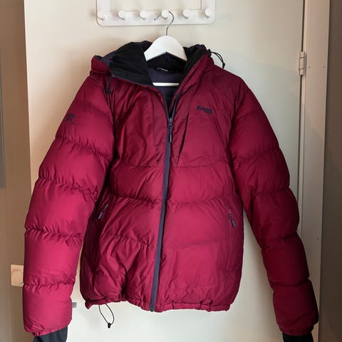 Jakken er pent brukt og ikke hull eller rifler. Den er puffen og har dunet jevnt fordelt over hele jakken. En liten svakhet (litt kvass på ene taggen)på lukke glidelåsen men fungerer som den skal.