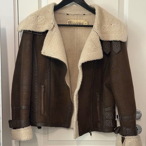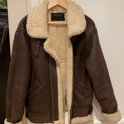 Jakken er laget av faux suede og foret med myk syntetisk "pels". Jakken er supermyk, varm og deilig å ha på. Har to ytre lommer og en low waist belte. Det står XS men det passer også for en S. Selges for 399kr.
