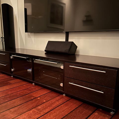 Selger strøken tv-benk med sort glassplate, Den har en skuff med svart glassfront og 2 hyller under. To smale sidehyller med dør på hver side.