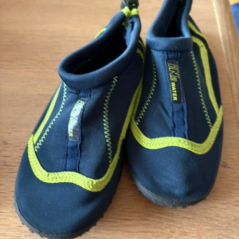 Reflex badesko for barn, unisex, i størrelse 32. Skoene er i blå og svart farge med mykt, fleksibelt materiale og gummisåle med mønster for bedre grep. Egnet som badesko eller strandsko til bruk ved vann, basseng eller på glatte underlag.