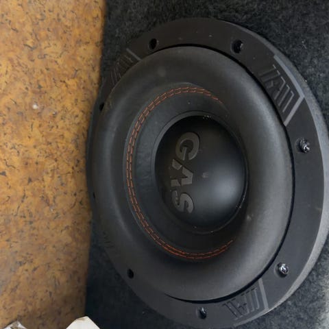 GAS MAD MAX B1-18 basspakke med 8" subwoofer i kasse og monoforsterker på 600W RMS. Denne er kun innspilt, selges da bil er solgt.